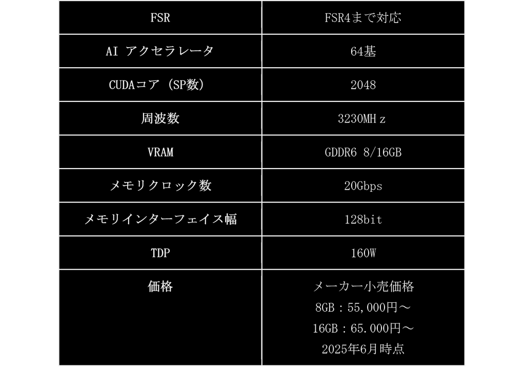 FSR4までのフレーム生成機能に対応し、AIとグラフィック処理用のコアが増強されています。