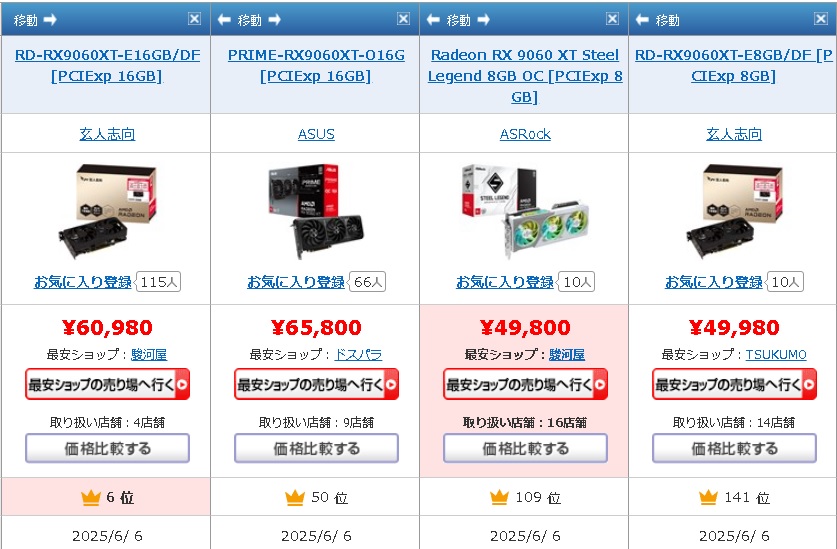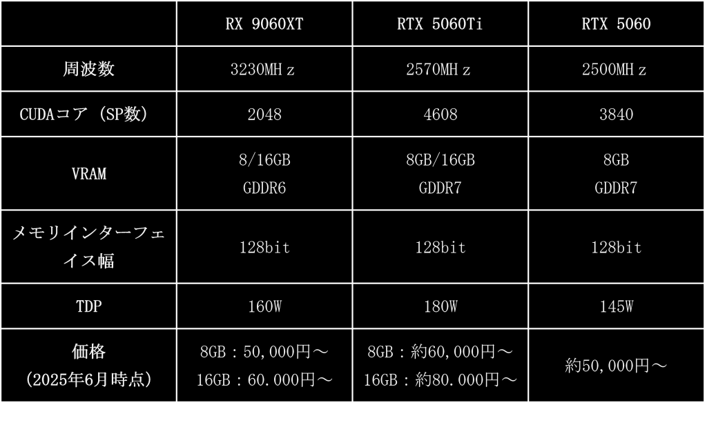 基礎スペックは若干RTX5060Tiが抜けて高いですが、その分16GBの価格がRX9060XTに比べて約二万円も差が出てしまっているため、コスパ面では圧倒的にRX9060XTが勝っています。