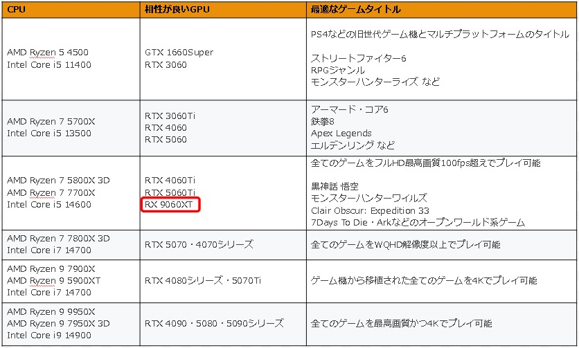 相応なCPUと組み合わせた場合、RX9060XTは最新ゲームを高画質かつ高fpsで遊べるグラボです。