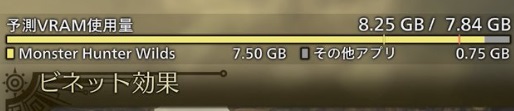 一例として『モンハンワイルズ』を高画質設定にすると8GBモデルのグラボはもうカツカツになってしまうので設定を下げざるをえません。