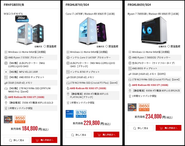 現在主要なBTOショップが取り扱っているRX9060XT搭載PCは、だいたい18~22万円です。