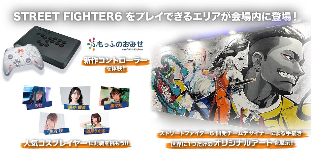 イベント会場では、格ゲー用のコントローラー試遊ブース・コスプレイヤーとの対戦会・各種グッズ販売などが盛り沢山です!