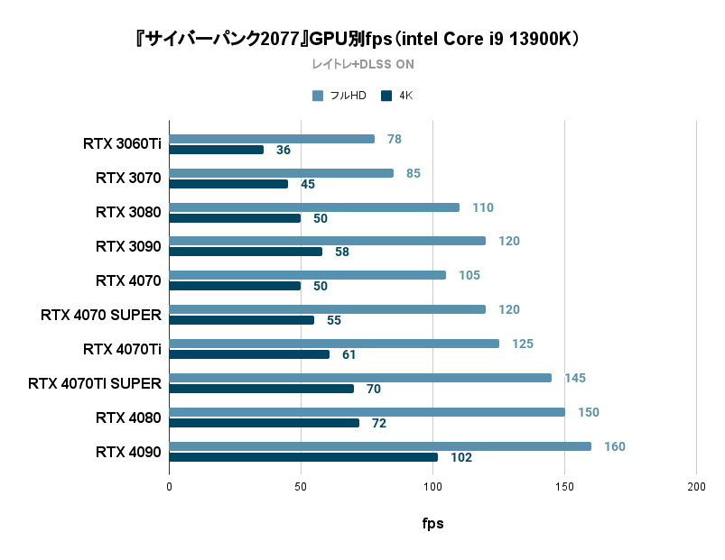 超重量級のPCゲームである『サイバーパンク2077』で他のGPUとのfpsを比較してみました。設定はフルHDと4KでそれぞれレイトレーシングとDLSSをONにした状態で、平均fpsを算出しています。