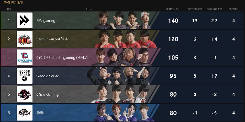 現在前半戦の1stステージの真っ只中ですが、以前「FAV gaming」が全勝で首位を独走しています。
