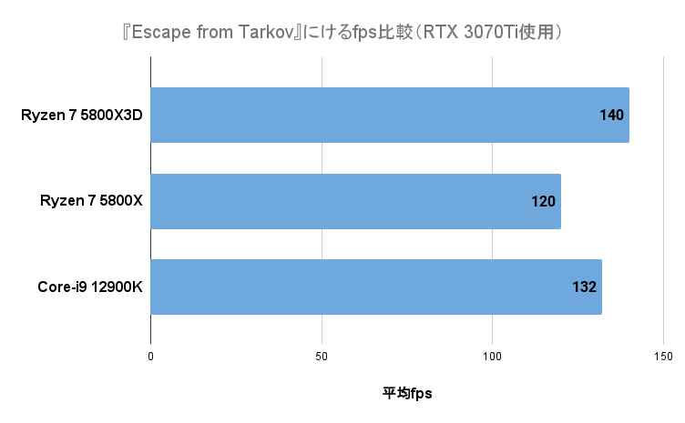 一例として『Escape from Tarkov』にてフルHD+DLSSをクオリティに設定した場合の、平均fpsをライバルCPUと比較してみました。