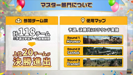 また、今回の「マスター部門」では決勝進出したチームには特別な称号「公式大会マスター」も用意しております。普段とは違う「PUBG MOBILE」をみんなでエンジョイしましょう!