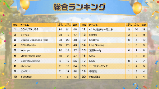 キル数・順位共に優れていた「DONUTS USG」が二冠となりました。
