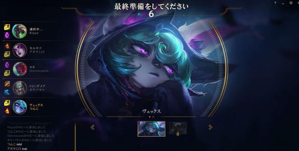もちろんレーンより先に、気になるチャンピオンから選んでも問題ありません。実際に、私自身も「ヴェックス」が使いたいのでMIDレーンでプレイしています!